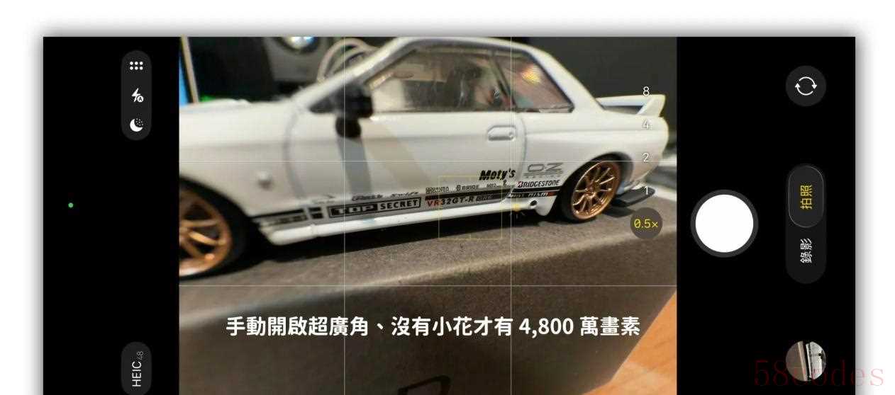 设置打开之后回到相机,会看到可以手动切换到48MP的入口。关键是,系统默认仍然是24MP,只有你手动点开48MP才会输出完整的4800万像素。这里要注意一个容易被忽略的点:当相机自动切到超广角模式,屏幕上会出现一个小花朵图标,那个时候即便你已经在设置里开启了高像素,系统也会退回到2400万输出。原因很简单,超广角在某些焦段是用裁切或不同的镜头组合来实现的,属于数码裁切范畴,无法利用传感器的全部像素,所以会降采样。