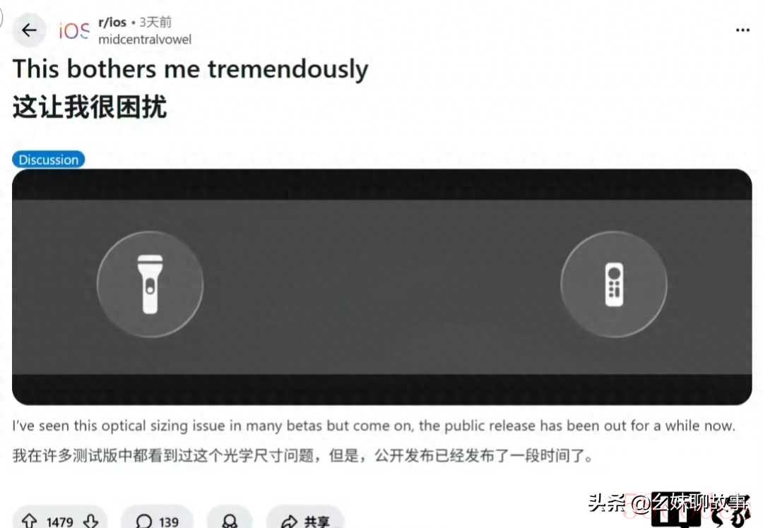 刚兴冲冲升级完iOS26的液态玻璃新界面,没等欣赏够灵动效果,就被锁屏上的图标整懵了——左边的手电筒图标看着明显比相机图标“瘦一圈”,强迫症当场犯了。翻了圈社交平台才发现,原来不是我手机出问题,好多人都在吐槽这图标大小不协调的事儿。