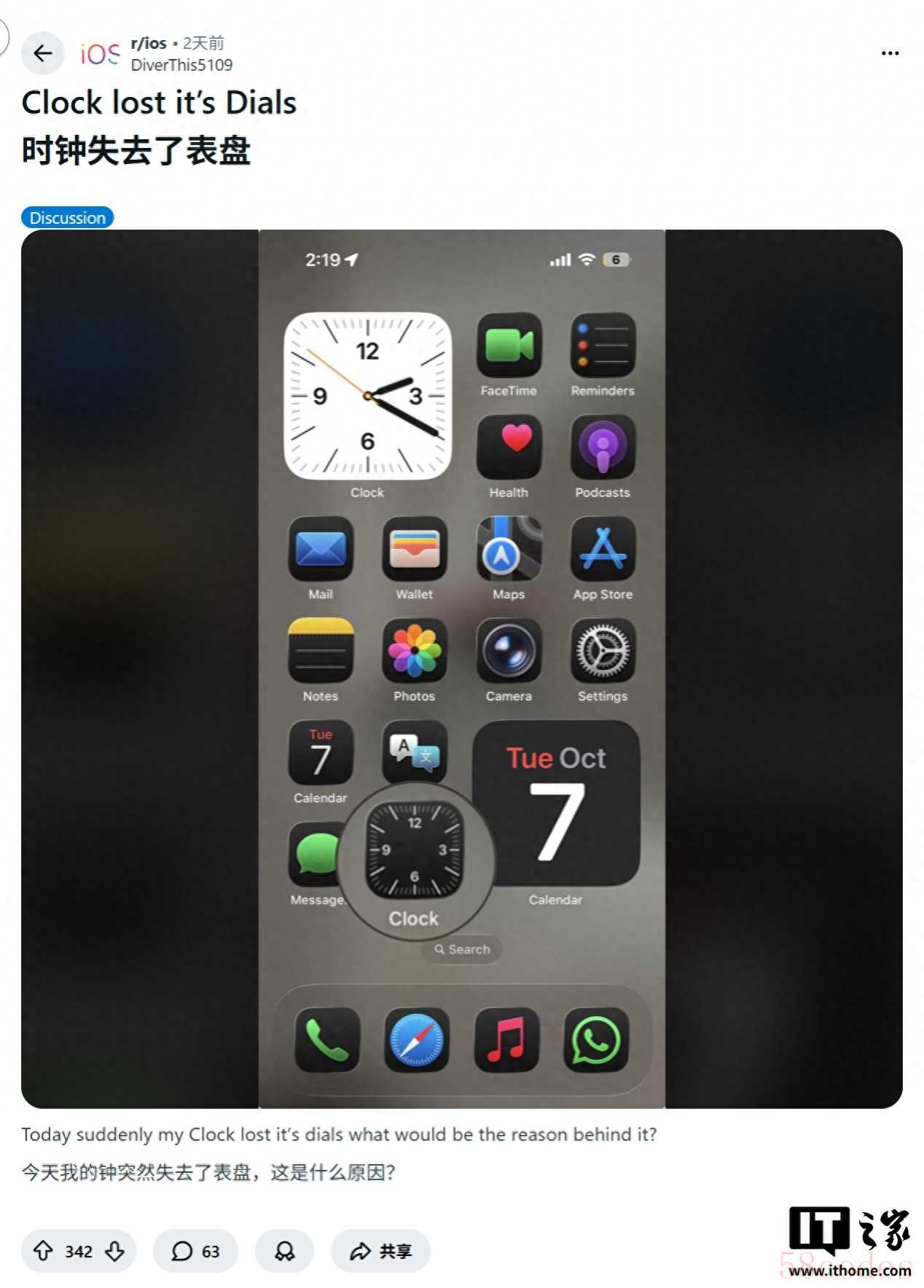 有报告指出,使用深色壁纸会使该问题更加明显。这是因为当图标与背景形成高对比度时,时钟指针更容易与背景的反射效果混淆,从而造成指针“消失”的错觉。IT之家查询该帖子网友回复,发现还有时钟指针存在,但时间刻度消失的情况。