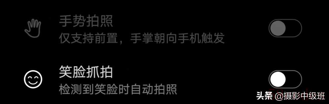 下图(图四),“手势拍照”,下边有相应的提示,需要转换到前置摄像头,才能“开启”这个功能。自拍时,只要掌心对着摄像头示意一下,就开启2秒快门倒计时了。超炫的一个功能!“笑脸抓拍”,这个功能更炫。设置为“开启”,不管是自拍,还是给别人拍照,只要被摄者一呲牙,快门立马启动抓拍。