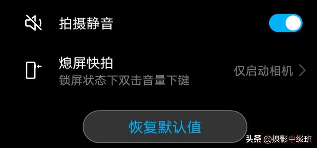 下图(图九),“拍摄静音”,这个功能我是“开启”的。开启之后,拍照片就不会有“咔咔”的模拟快门声。尤其在安静的场合拍摄,容易打扰到别人,音效又不好听,干脆静音。不用担心拍不到,可以在按下快门瞬间,留意左下角“快门按钮”旁边的小圆框,会立即显示最新拍摄的照片的。“息屏快拍”,这个功能不错。按照下边的提示“锁屏状态下双击音量下键”,有两个选项,一是“仅启动相机”,二是“启动相机并拍摄”,这个适合非常紧急情况下的抓拍。其中“仅启动相机”,是有个构图和按快门的动作的,“启动相机并拍摄”,就要求高了,纯属于盲拍。
