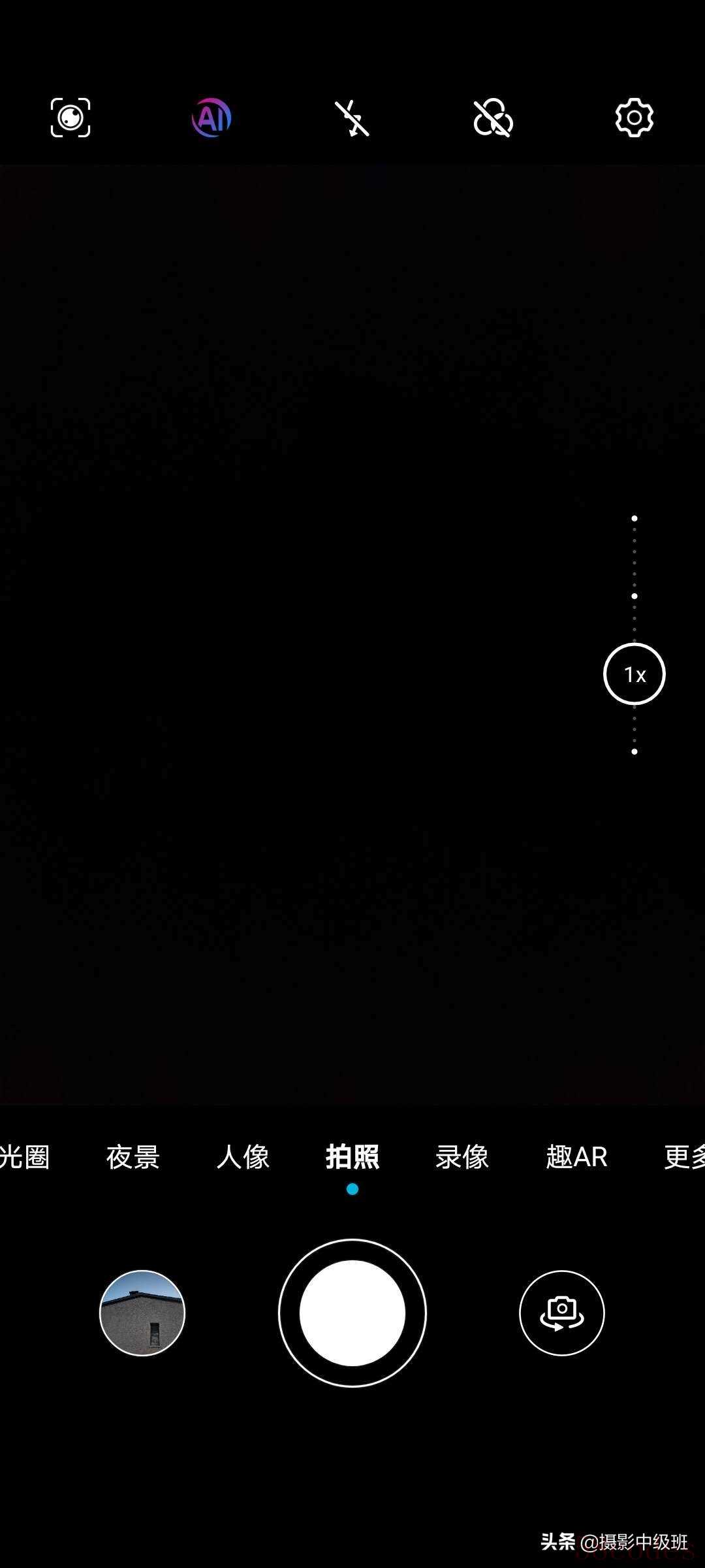 首先,打开手机拍照页面,如下图(图一),上边一排按钮,从左至右,分别是“识物”、“AI摄影”、“闪光灯”、“照片风格”、“设置”。