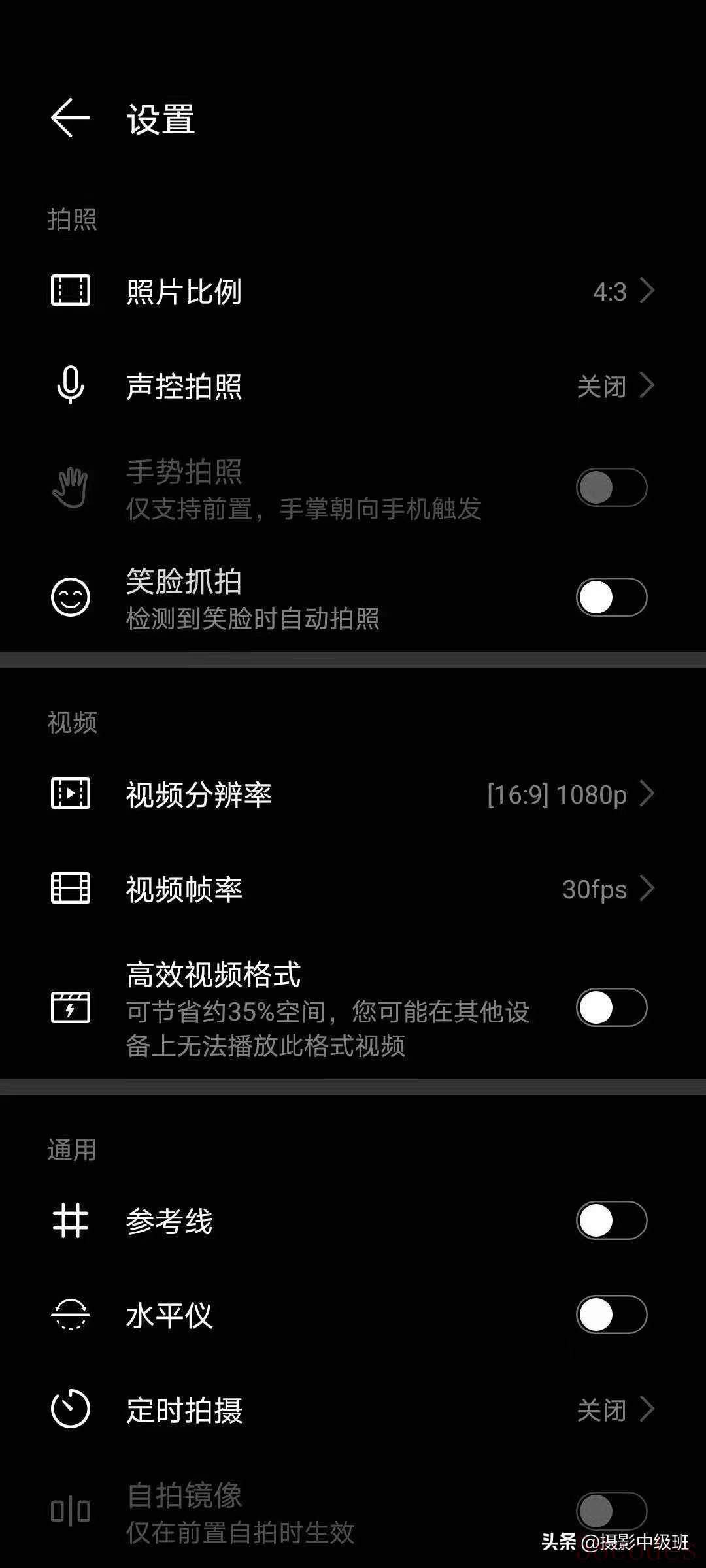 拍照页面的下边,还有一排按钮,都是文字标着的,就直观易懂。但其中还有许多需要设置的参数,这一排按钮留着下一期讲,今天先讲右上角的“设置”按钮里的内容。点击右上角的“设置”按钮,进入下面这个页面(图二)。