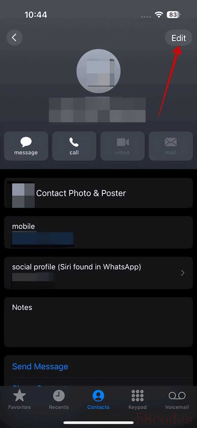 如果该号码出现在多个联系人下,那就说明你有问题。您有重复的联系人!点击其中一个结果即可打开联系人页面。点击右上角的“编辑”。
