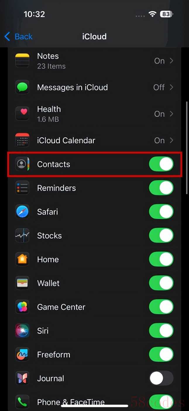 联系人姓名未显示在“电话”和“信息”应用中的另一个可能原因是 iOS 设置中的 iCloud 通讯录未启用。如果您不小心禁用了 iCloud 通讯录,就可能会发生这种情况。要修复此问题,请前往“设置”->“iCloud”。