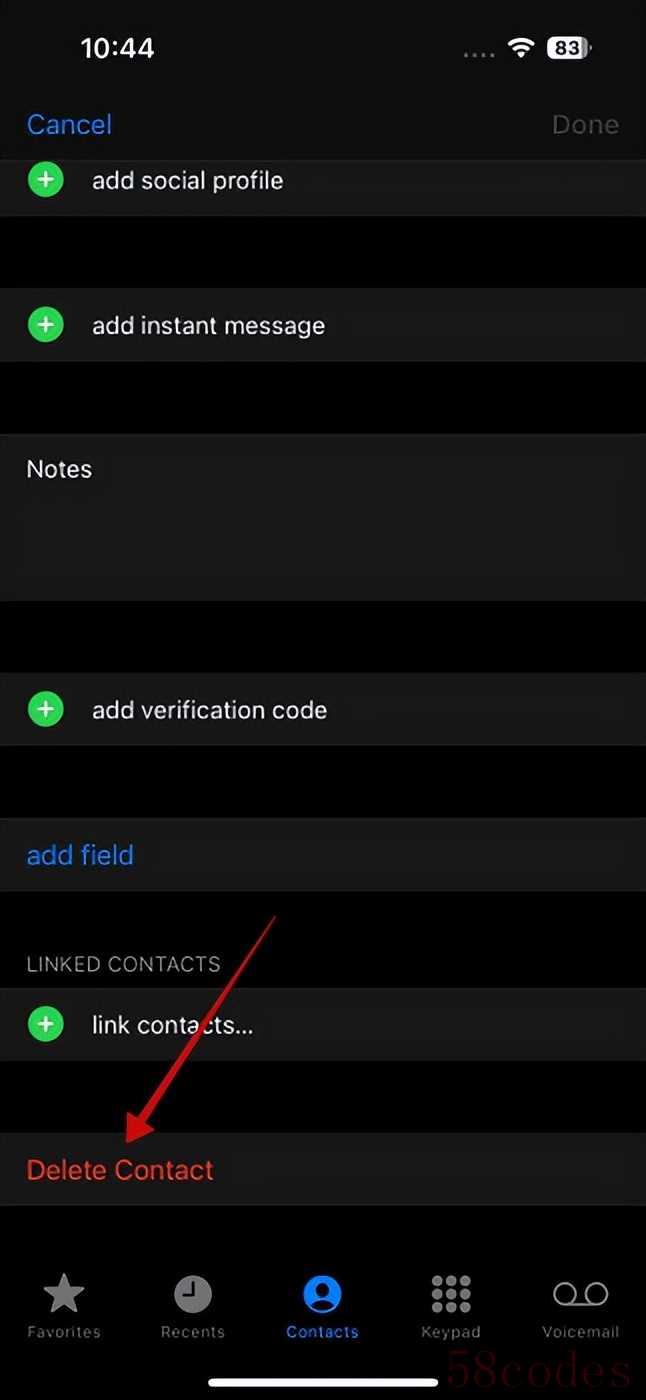 在下一个屏幕上,向下滑动到底部,然后点击“删除联系人”。