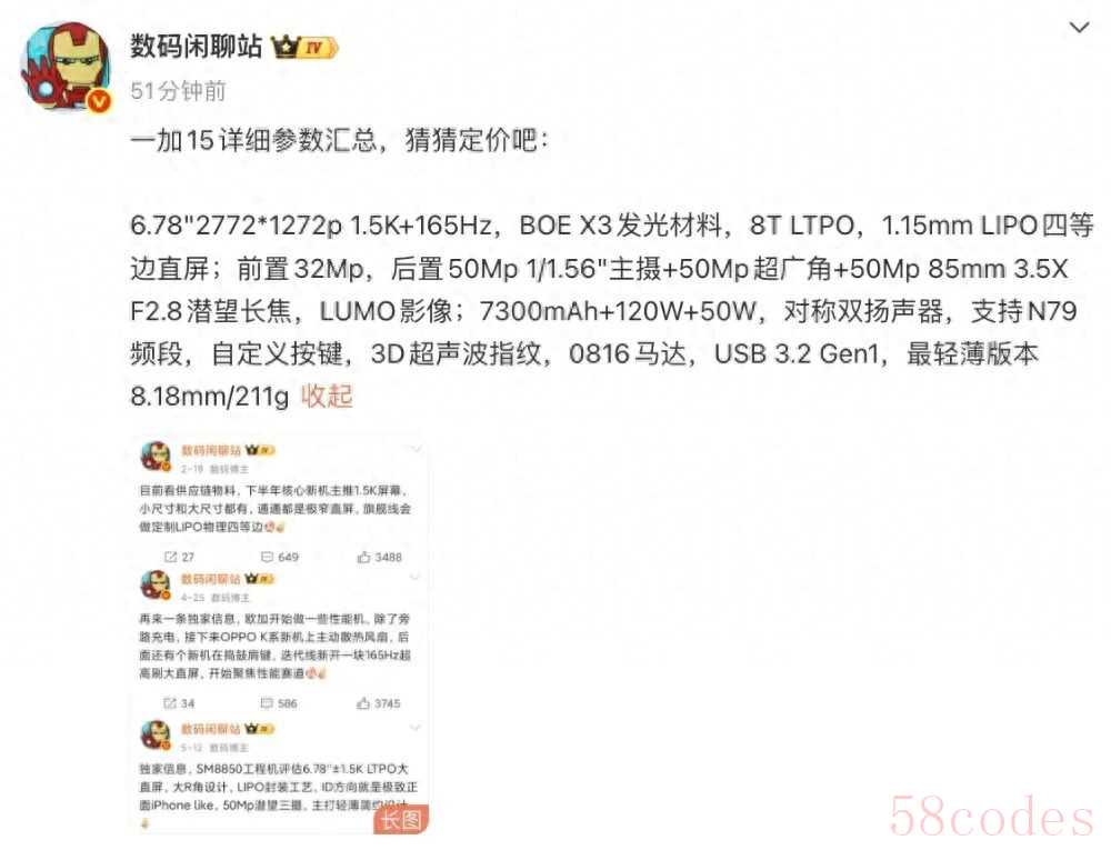 全新的一加15手机将于10 月 27 日 19:00发布亮相,目前已经公布了大量产品细节信息。今天,博主@数码闲聊站 带来了一加15详细参数汇总。结合来看,全新的一加15手机将配备6.78英寸2772*1272p 1.5K+165Hz屏幕,BOE X3发光材料,8T LTPO,1.15mm LIPO四等边直屏,支持3D超声波指纹。