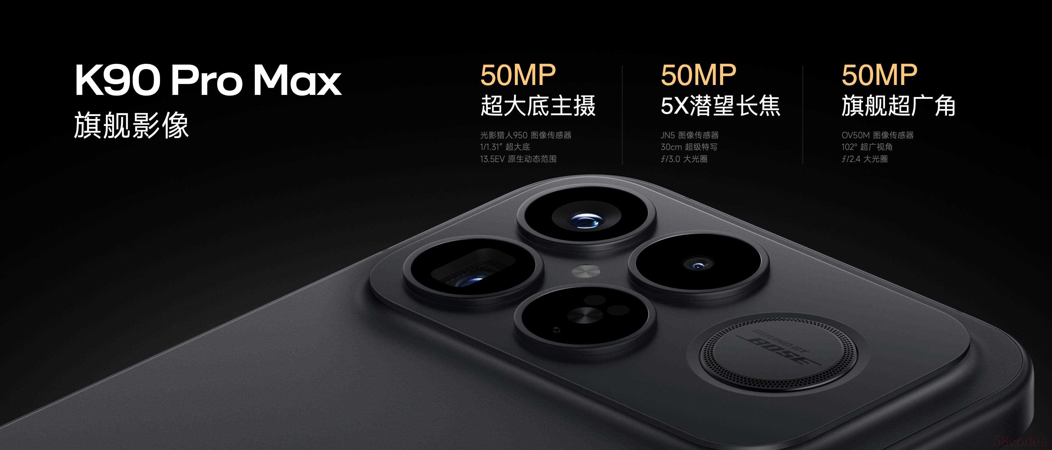 音频方面,REDMI与Bose达成深度合作,K90系列为双方合作首秀。K90 Pro Max搭载双方共同打造的三扬声器声学系统,构建全链路2.1声道,结合Bose六十年音频技术积淀与Sound by Bose技术,实现低音饱满、细节丰富、人声清晰的沉浸式声场体验。