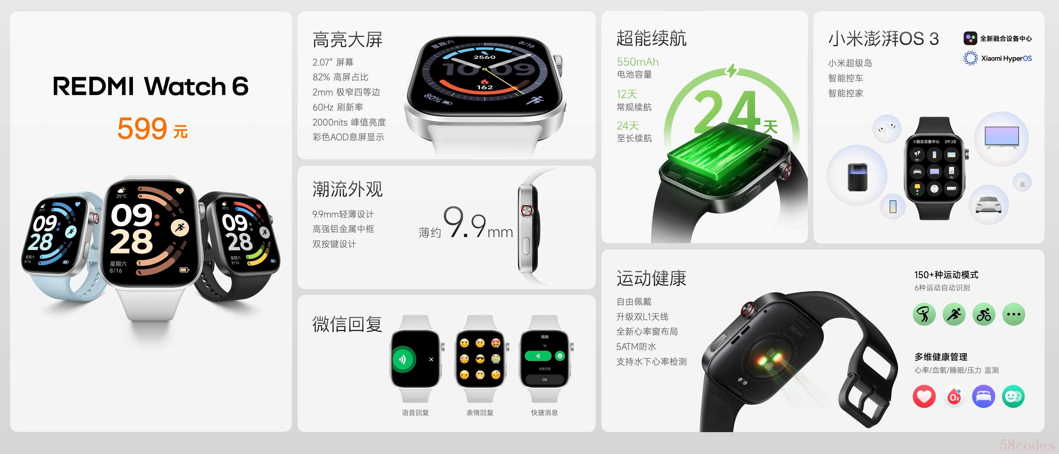 功能上,REDMI Watch 6搭载小米澎湃OS 3,支持表端控车(含SU7/YU7等NFC车钥匙)、米家互联与小米超级岛,可收发微信消息并支持文字、语音、表情回复;健康监测涵盖心率、血氧、睡眠、压力、女性健康管理,内置呼吸训练功能;运动方面支持150+种运动模式,含6种运动自动识别,具备5ATM防水、GNSS独立定位与双L1天线导航。续航上,该手表内置550mAh电池,常规使用续航12天,最长可达24天,提供典雅黑、皎月银、迷雾蓝三款配色,搭配200余款潮流表盘及悬浮人像表盘,售价599元,发布会后正式开售。