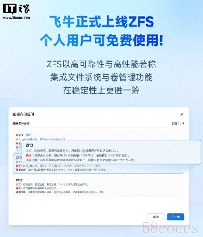 这是一个非常值得关注的消息!国产 NAS 系统飞牛(FNAS)的 fnOS 新增 ZFS 文件系统,并且对个人用户免费开放,这可能会对 NAS 市场和用户选择产生重要影响。