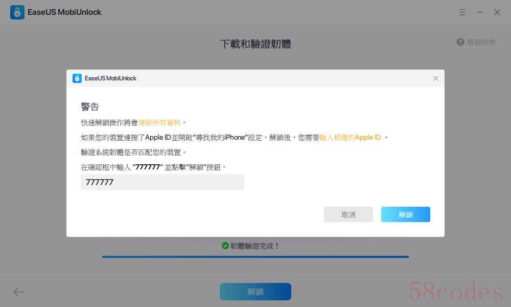 步骤4. 验证完成后,点击「解锁」。在警告窗口中输入所需信息,再次点击「解锁」即可解锁iPhone、iPad和iPod,无需输入密码。