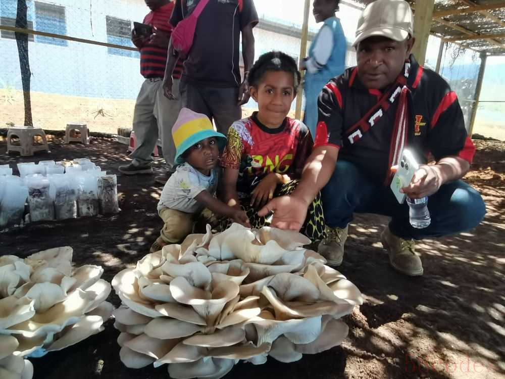 2025年9月29日,在巴布亚新几内亚东高地省首府戈罗卡市,当地民众参观中国援巴布亚新几内亚菌草旱稻项目永久性示范基地种植的大平菇。2018年以来,中方在当地举办技术培训班41期,培训学员3200余人,技术推广到巴新10个省20个地区,成千上万当地民众从中受益。