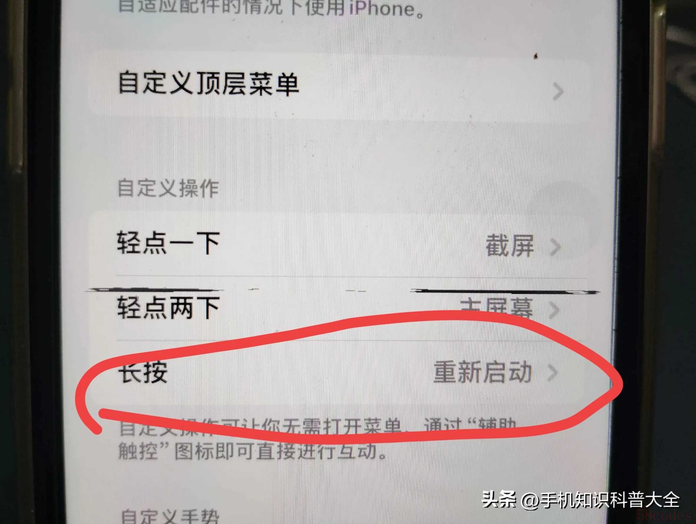 接着在自定义操作里随意勾选一个操作,比如长按,然后往上滑找到重新启动。当需要关机时,长按这个悬浮球就能重新启动。(如上图所示)
