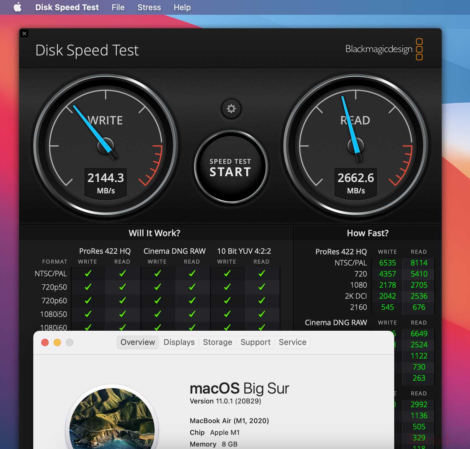 得益于M1的新SSD控制器,连续读写能力达到了2400Mb/s以上,而Intel Air只有1200Mb/s。随机读写能力也大幅增强。这让打开应用程序、睡眠唤醒都得到了,可以说是革命性的提升。