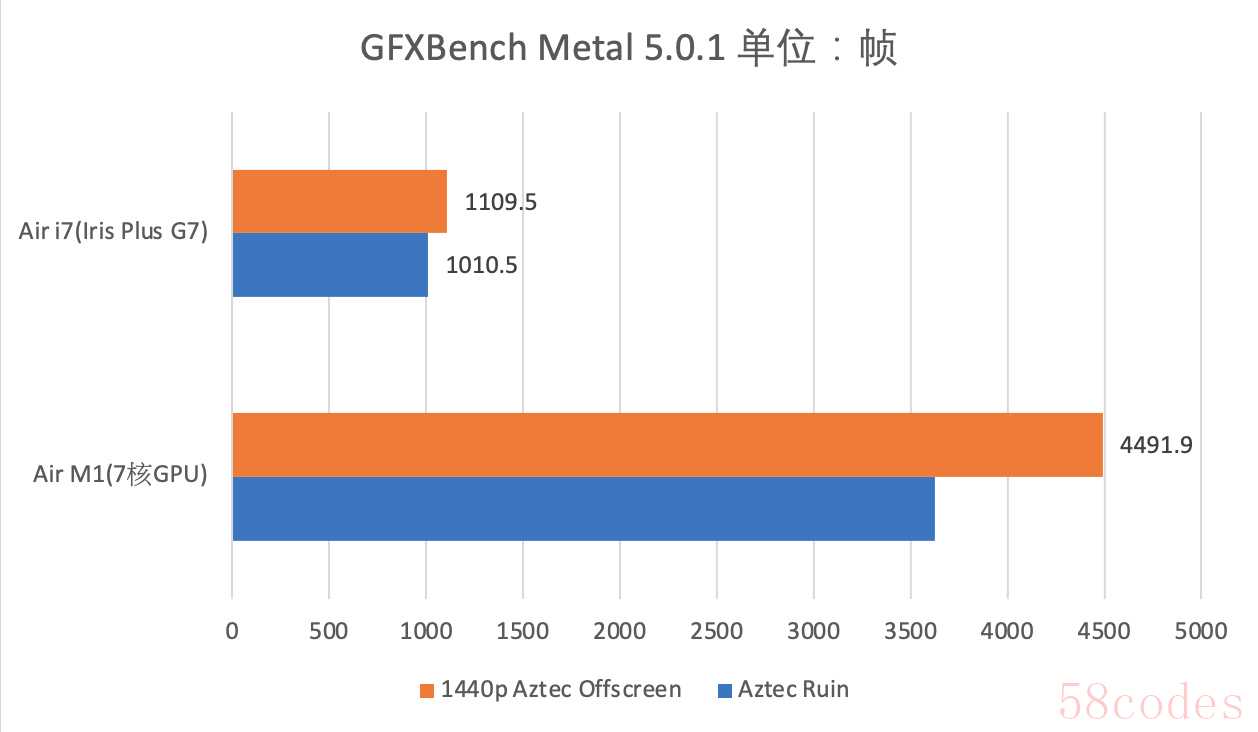 年轻人不讲武德,Intel曾经的最强核显Iris毫无面子。苹果宣称M1拥有2.6T的浮点运算能力,轻轻松松就抬走了Intel Iris核显,据网上其他跑分资料显示其分数已经和桌面级GTX1050Ti和RX560相当。值得注意的是,我的Air是残血M1,少一颗GPU核心,如果是满血M1,其实力会更强(按照过去A12X和A12Z的比例来看差距约15%)。
