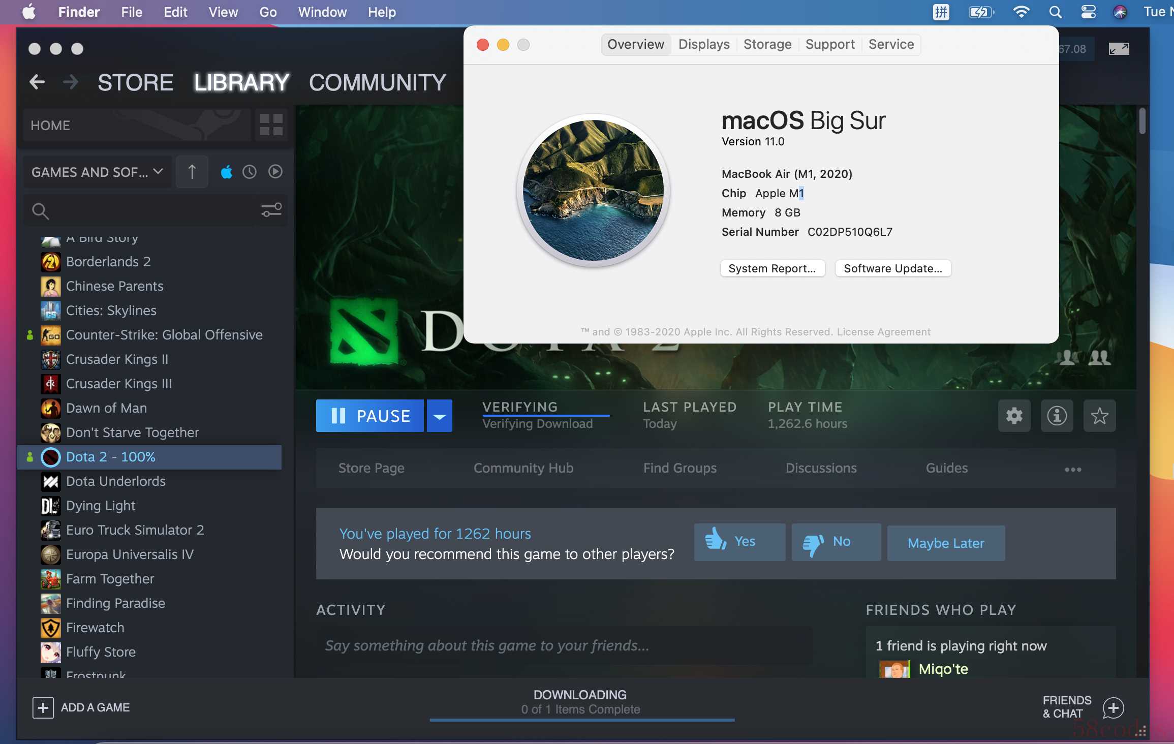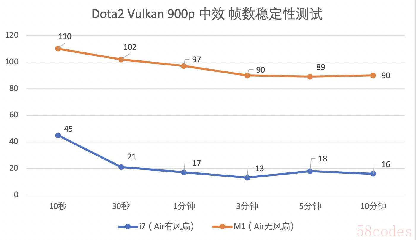说白了,Intel因为降频发热,实际性能并没有Geekbench峰值跑出来那样高。而M1的低发热使其持续性能输出更好,更符合Geekbench跑出来的峰值性能。这点我们从Dota2的10分钟测试便可以看到,Intel款尽管有风扇加持,经过10分钟的测试后,还是“体力透支”了,而无风扇的M1继续坚挺着。