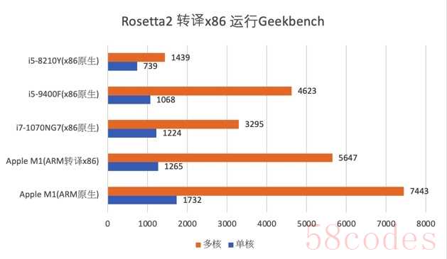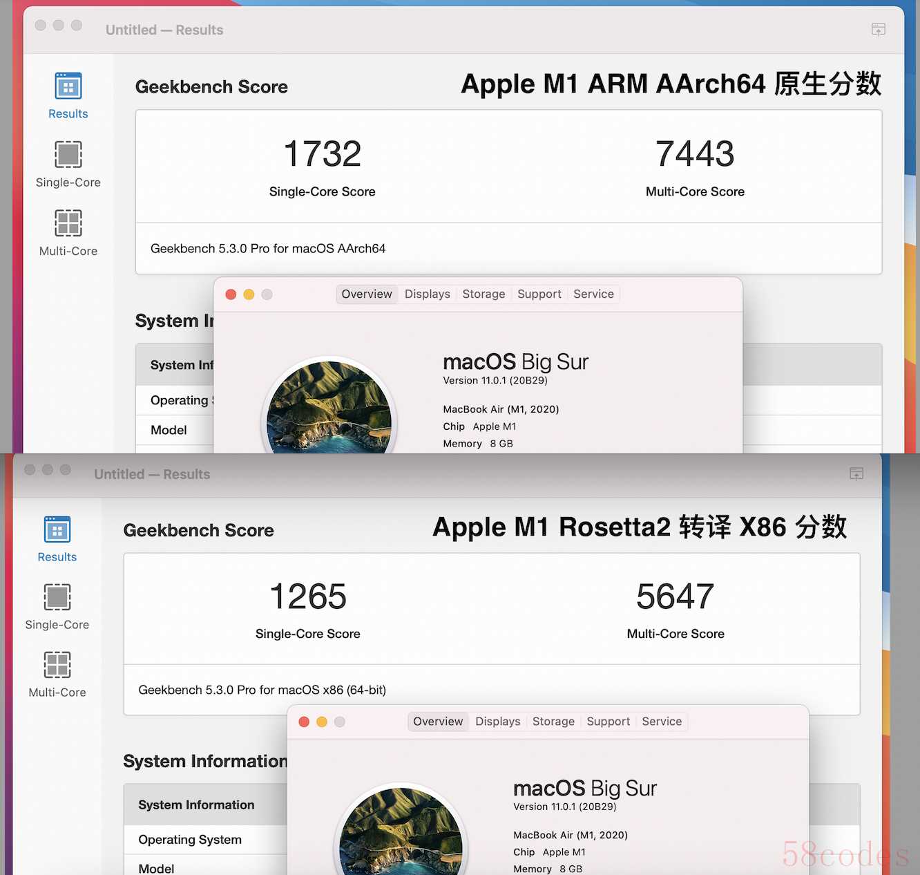 直观体验后我们将用数据说话,测试CPU、GPU的各项性能。因为还有许多软件并未完全适配M1,而是使用Rosetta模拟器进行运作,所以在图中会特别标注。