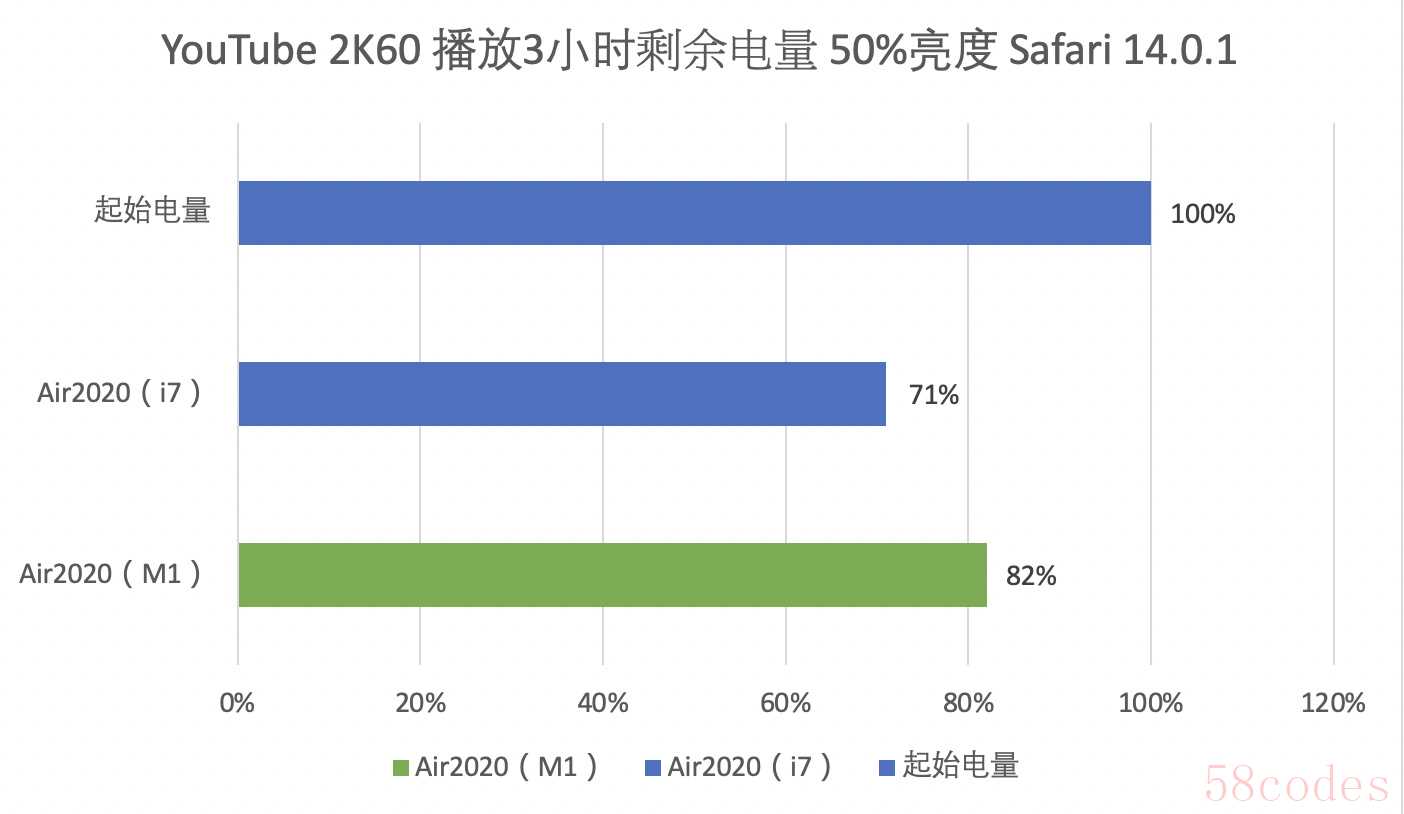 M1不仅带来了性能、安静和低发热,续航的提升也是另一个激动人心的地方。碍于时间关系没有细测。根据苹果官网给的参考,Intel的Air使用时间是12小时视频播放,而M1的Air是18小时视频播放。多出了整整6个小时。这里我们采用视频播放3小时的剩余电量来进行对比实验。(对照中i7 Air电池循环42次,基本不影响结果准确性,M1 Air循环则为0次)