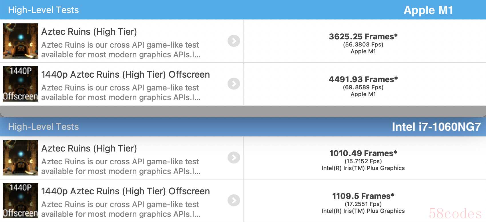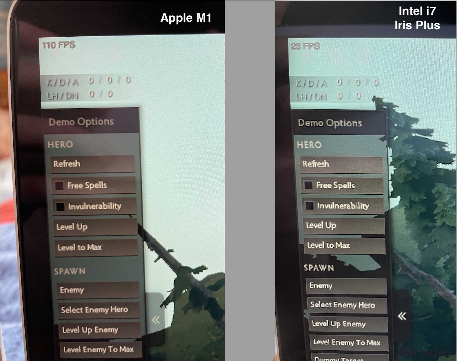 不测不知道,一测吓一跳。可以看到M1尽管是用Rosetta2模拟运行的x86 Dota2,但这帧数,整整领先Intel Iris三倍之多。加上Intel发热严重高于M1,风扇非常吵闹。实际感受就是Intel卡成了ppt,简直没法继续游戏,而M1是能很流畅,注意,是很流畅的运行这款游戏。(游戏帧率稳定性和持续性能测试在后面)