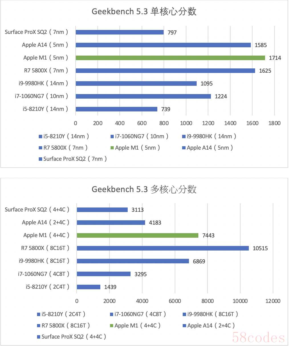 至于同为ARM的隔壁微软Surface Pro X最新定制的SQ2处理器,则只有M1的一半都不到。值得注意的是,M1的最高频率只有3.2GHz,但已经实现了和4.7GHz的R7 5800X同样的单核性能,而睿频高达5.0GHz 的i9-9980HK,它的单核性能竟大幅落后于只有3.2GHz的M1。可见M1的IPC效能已经达到了可以说是极其恐怖的程度。