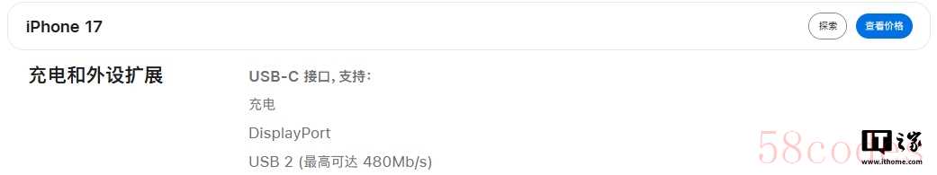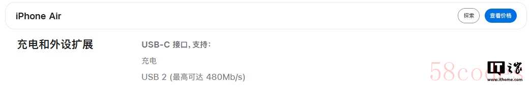 IT之家注意到,苹果官方显示,iPhone Air USB-C 接口缺失了“DisplayPort”功能,仅支持充电、USB 2(最高可达 480Mb/s),而隔壁的 iPhone 17 标准版则支持充电、DisplayPort、USB 2(最高可达 480Mb/s)。
