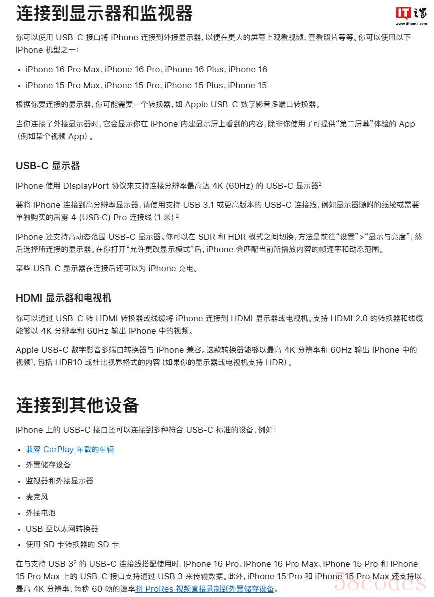 ▲ 图源:苹果官网截图 | iPhone 17(充电和外设扩展)这意味着 iPhone Air 不可以使用 DisplayPort 协议来支持连接分辨率最高达 4K (60Hz) 的 USB-C 显示器。苹果官网显示,iPhone 上的 USB-C 接口可以连接到多种符合 USB-C 标准的设备,例如: