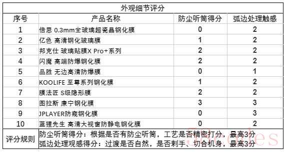 那么这10款手机膜都有没有听筒防尘呢?上表:
