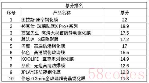 在经过多项测试之后,我们得出了一项总表,图拉斯康宁钢化膜、邦克仕玻璃贴膜X Pro+系列、蓝猩先生 高清大视窗防静电钢化膜获得了本次测试的前三名,相比其他品牌的钢化膜它们的耐压程度更加出色,也更耐刮擦;但凭借在听筒防尘、弧边处理等细节部分更胜一筹的处理,图拉斯康宁钢化膜成为了我们这次测试的“最终赢家”。