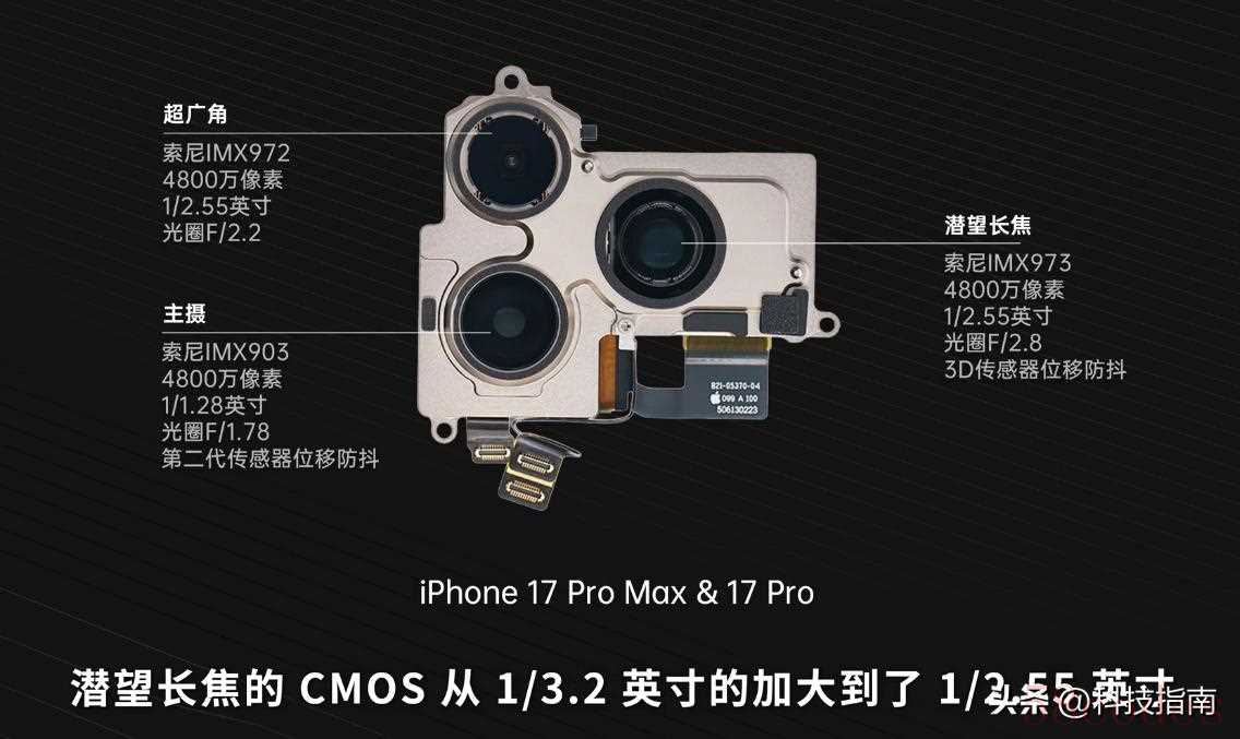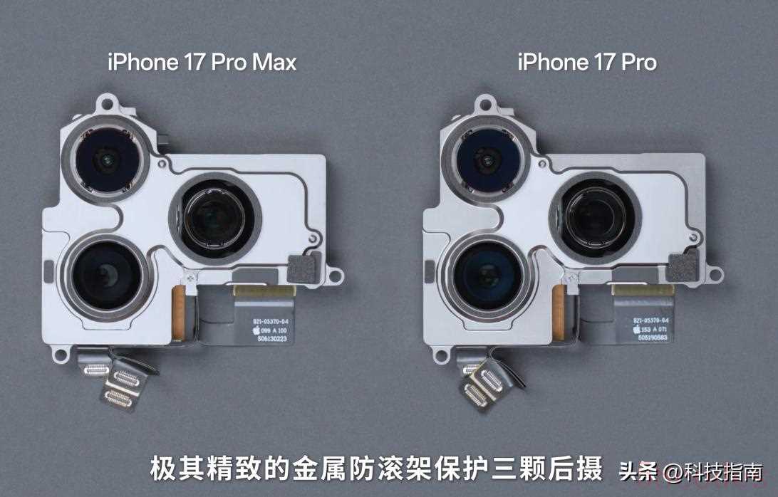 iPhone 17 Pro 的后置三摄模组是拆解中的 “重头戏”:
