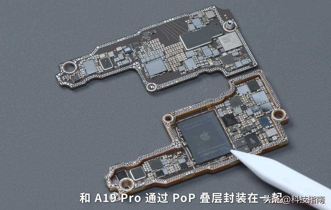 取下盖板后,A19 芯片的封装工艺清晰可见:采用 3nm + 制程的芯片体积比 A18 小约 8%,但针脚密度更高,这也是其性能提升(CPU 性能提升 20%、GPU 提升 25%)的关键。值得注意的是,主板上的存储芯片(闪存)与 A19 芯片采用 “堆叠封装” 设计,不仅节省空间,还能提升数据传输速度,实测读取速度达到 7500MB/s,比前代快约 10%。