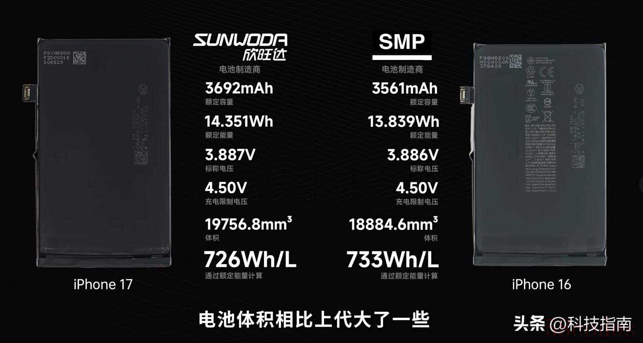 iPhone 17 标准版和 Pro 版的电池容量差异明显:标准版电池容量约 3850mAh,Pro 版则达到 4500mAh,均比前代提升约 10%。拆解时发现,Pro 版电池采用 “双电芯堆叠” 设计,电芯来自宁德时代和松下两家供应商,且电池保护板上的芯片数量增加到 3 颗,推测是为了更精准地控制电池充放电,延长电池循环寿命(官方数据显示 Pro 系列电池循环 1000 次后仍能保持 80% 容量,比前代多 100 次循环)。