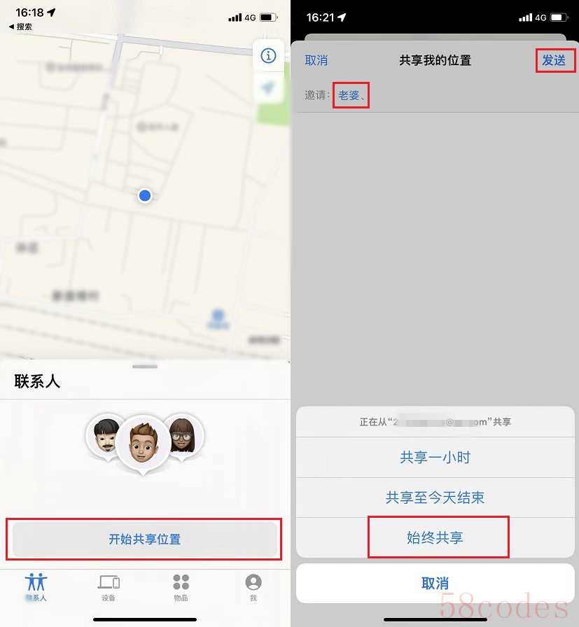1、首先打开手机自带的的 查找App,点击“开始共享位置”,在后面输入手机通讯录或者Apple ID账号,点击“发送”,选择“始终共享”,如图: