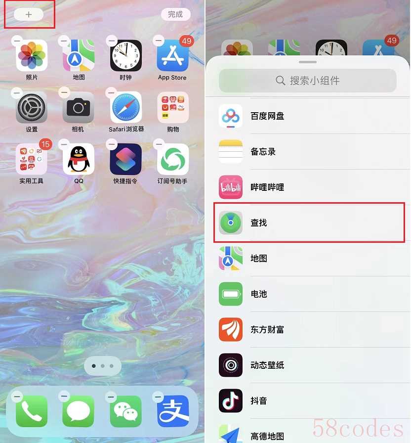 接下来为了查找方便,你还可以在主屏幕将查找APP添加小组件,长按手机屏幕点击左上角的“+”号,然后找到查找小组件进行添加到主屏幕即可。