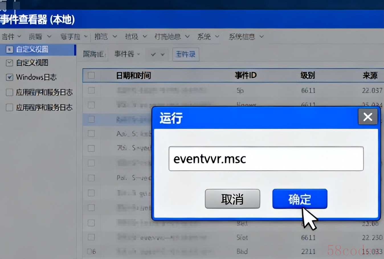 按下 “Win+R” 组合键,打开 “运行” 对话框,输入 “eventvwr.msc”,点击 “确定”,打开 “事件查看器”;