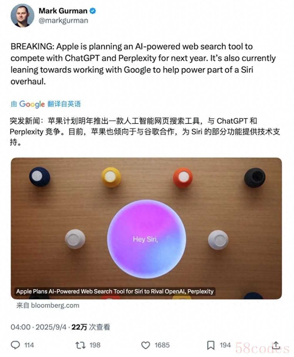 智东西9月4日消息,知名苹果爆料人、彭博社记者马克·古尔曼(Mark Gurman)最新爆料,苹果计划于明年春季推出自研AI搜索工具“答案引擎”。