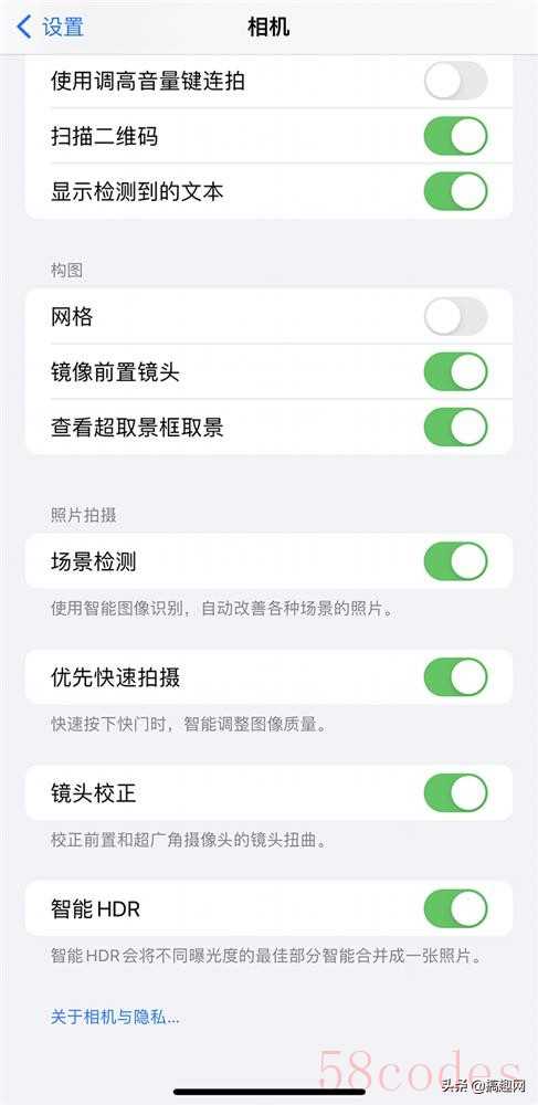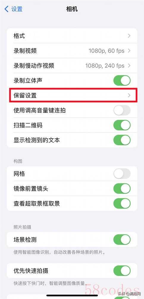 从相机设置页面找到构图区,将“镜像前置镜头”打开,能够避免 iPhone前置镜头会导致照片左右翻转问题。