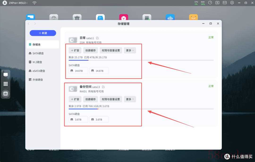 现在所有品牌的NAS都支持多个存储池,我可以2块盘组成ZDR阵列,2块盘组成RAID1阵列。重要数据放在RAID1上面,不重要的就放在ZDR里面。多块硬盘组合下,轻松上30TB容量。