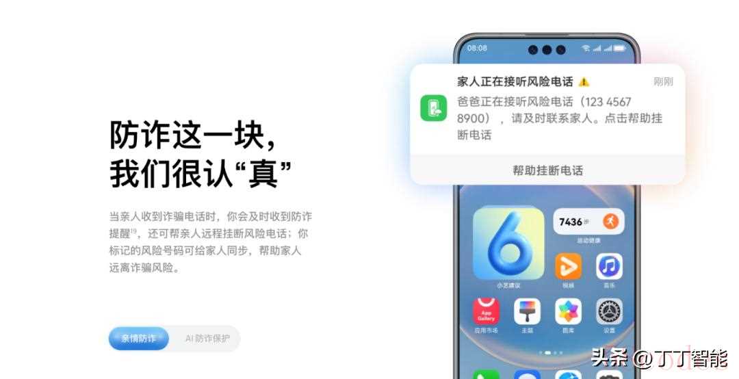 防诈骗也升级了,语音和视频通话能识别诈骗风险、AI 换脸,遇到骗子会提醒你;如果家人也用鸿蒙 6,TA 接到诈骗电话时,你会同步收到提醒,还能帮 TA 挂断,再也不用怕长辈被骗钱。