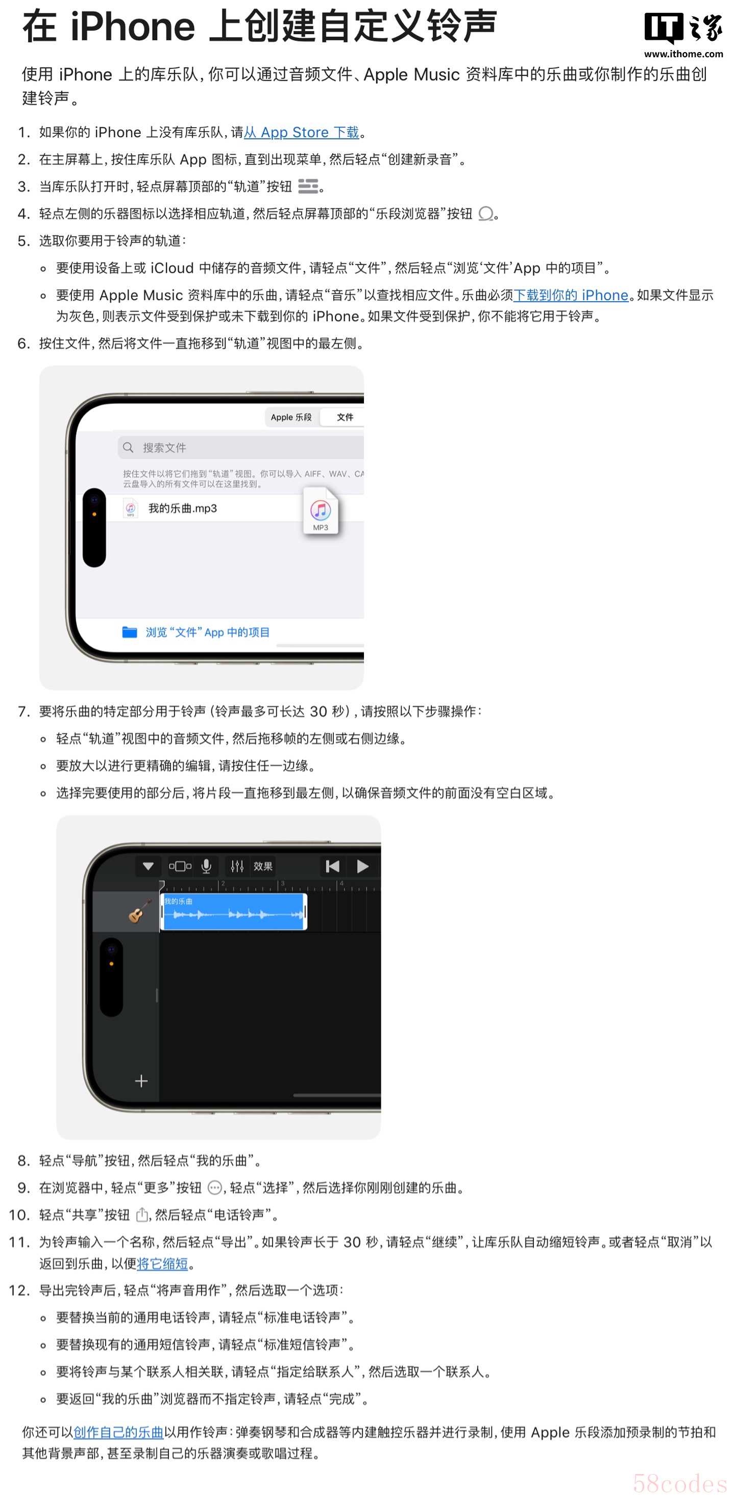 作为比较,此前用户为 iPhone 设置自定义铃声较为复杂,例如在手机端需要安装 GarageBand(库乐队)应用,并手动将长音频文件裁切至短于 30 秒,导出成铃声格式,再导入 iPhone 的铃声列表。对用户来说,这种流程较为复杂繁琐。
