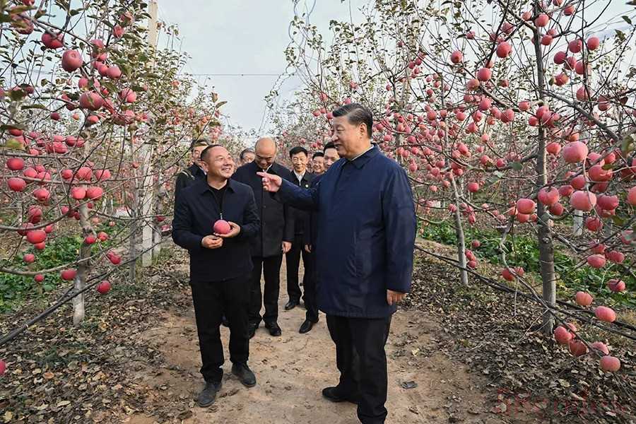 2022年10月26日至28日,习近平在陕西省延安市、河南省安阳市考察。图为26日下午,习近平在延安市安塞区高桥镇南沟村苹果园同老乡们亲切交流。新华社记者 燕雁 摄