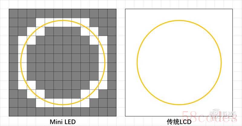 比如在上面这张图里,左右两块屏幕,同样要显示一个“圆”,传统LCD屏幕通常是侧入式背光,只能整体点亮;而左边的Mini LED屏幕由于背光分区极多,就可以独立控制,只需要开启显示画面区域的背光即可。