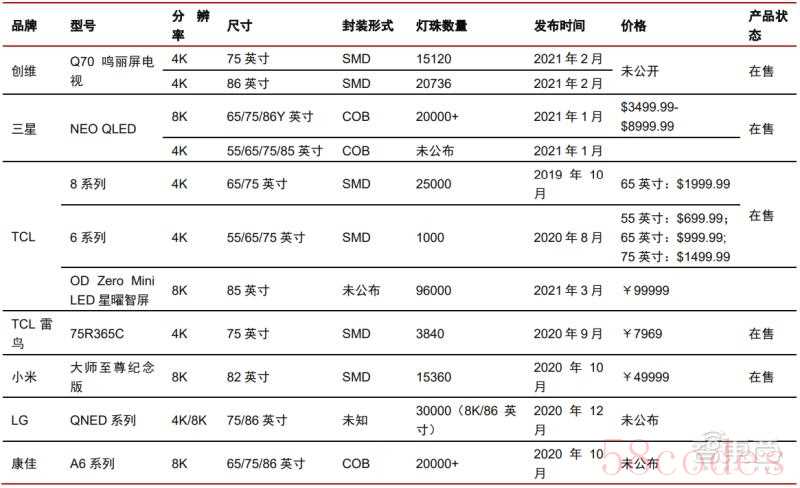 从2019年12月微星推出首款Mini LED笔记本电脑概念产品,到2021年年初,三星、LG、TCL、康佳、创维、长虹纷纷推出Mini LED电视产品,再到苹果新款iPad Pro开售,2021年,无疑将成为Mini LED技术正式商用的元年。