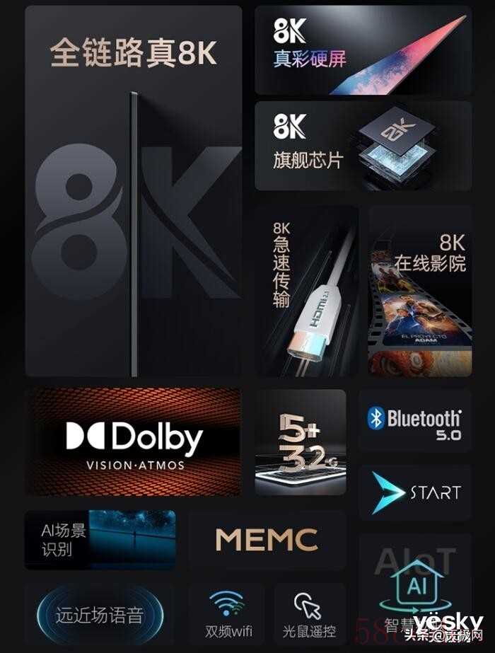 2.  "分辨率 (Resolution):" 真正的8K分辨率 (7680 x 4320像素)。这是目前电视市场中最高的分辨率标准,能提供极其细腻、丰富的画面细节,尤其在大尺寸屏幕上效果更明显。