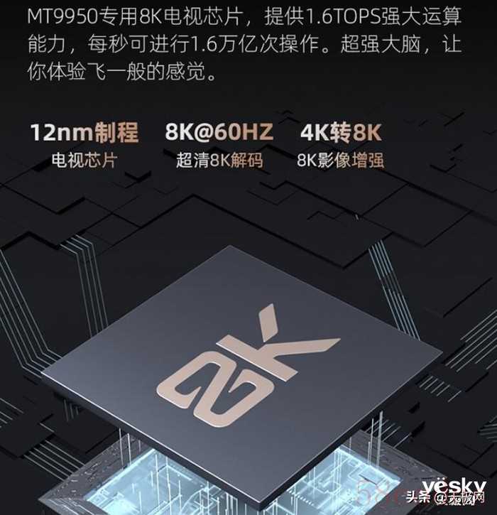 长虹D8K电视采用MT9950芯片,是联发科的8K专用芯片,可提供1.6TOPS算力,可以处理解码8K分辨率的视频。它有四核A73处理器,四核G52 GPU,12nm制程,具有4K转8K技术。5+32GB存储,5GB的运存也是8K电视需要具有的内存了。