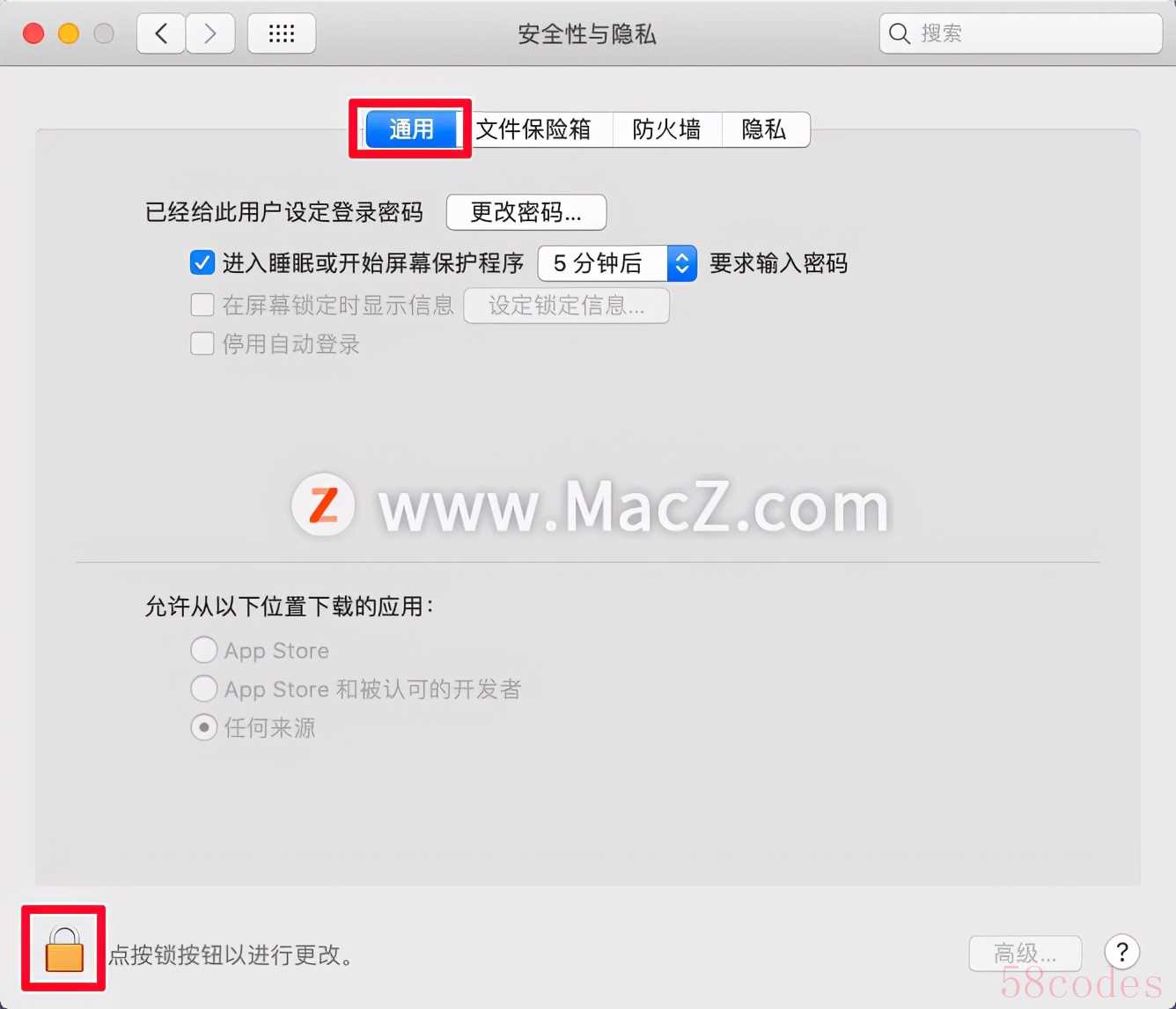 3.切换到「通用」,点选左下角的「锁头」图标并输入密码来解锁。