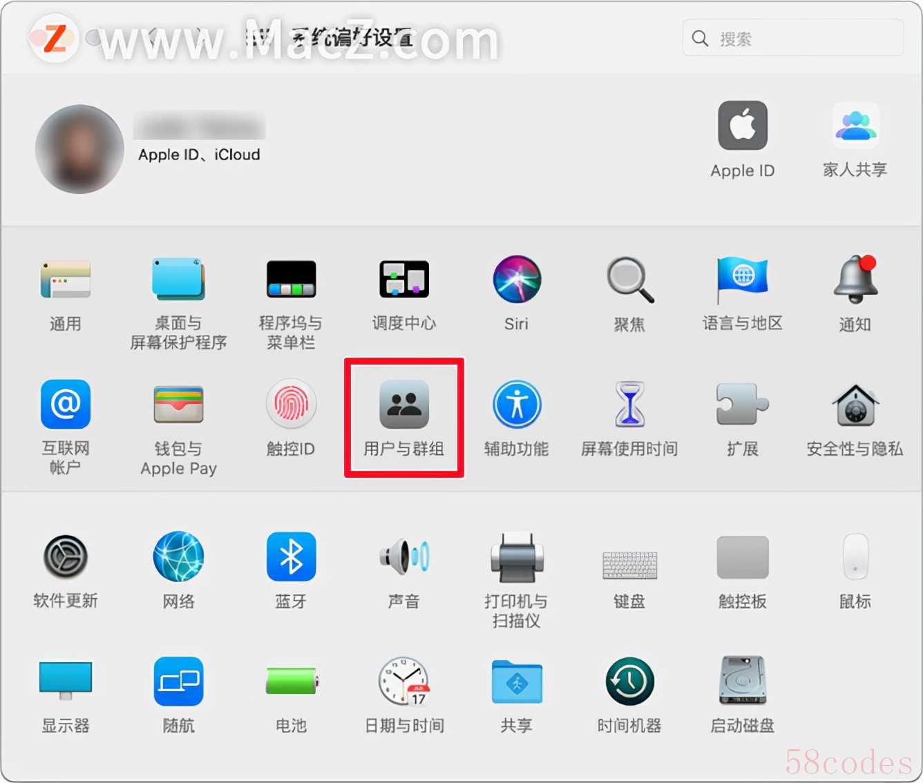 1.单击选单列左上角的「苹果」图标,开启「系统偏好设置」,点选「用户与群组」。