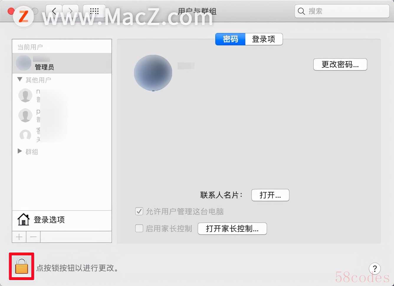 2.切换到目前的管理者帐户,然后单击左下角的「锁头」并输入密码解锁。