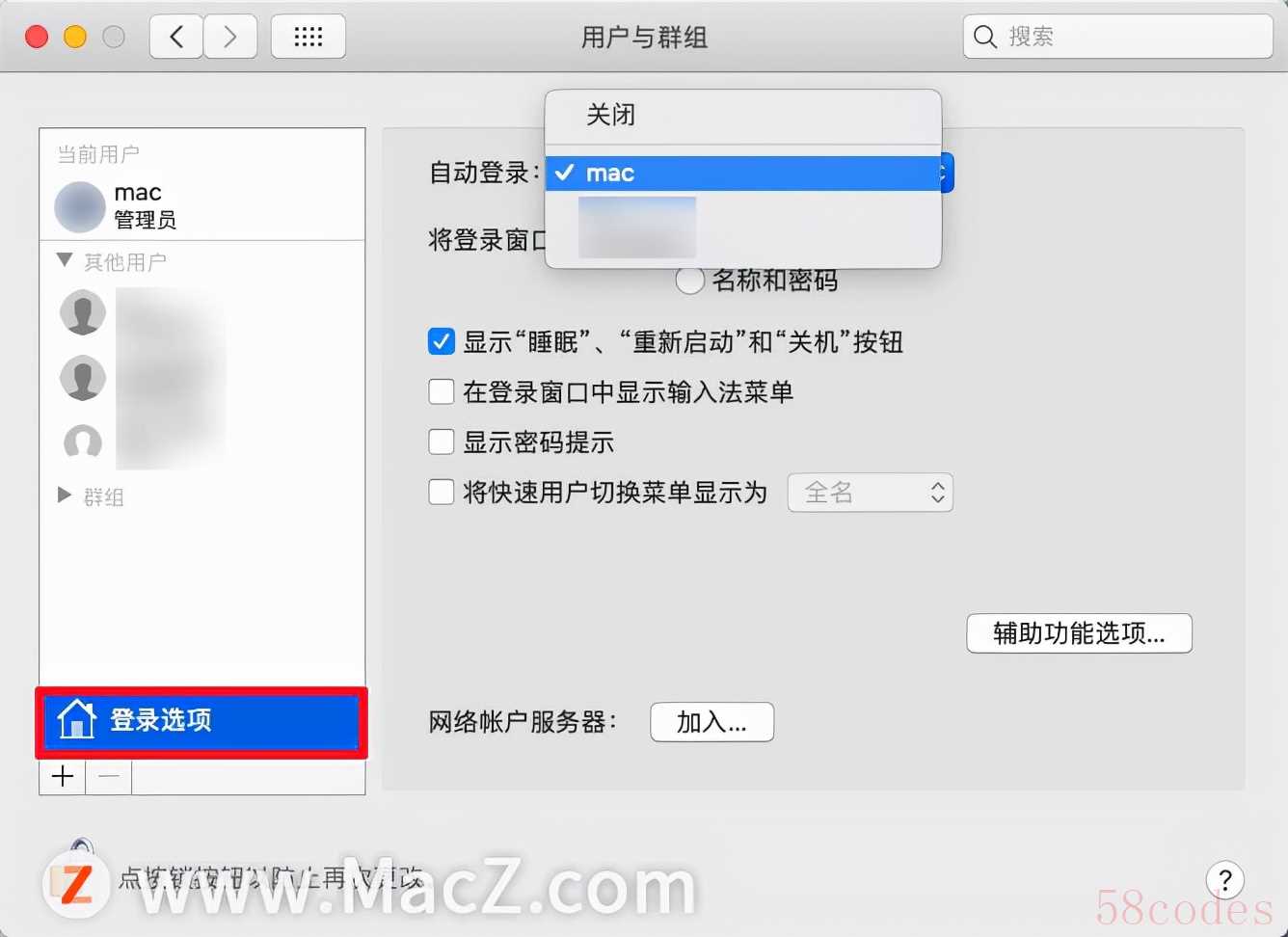 4.在「自动登入」菜单内,从「关闭」改为你的使用者帐户,然后再次输入密码确认。