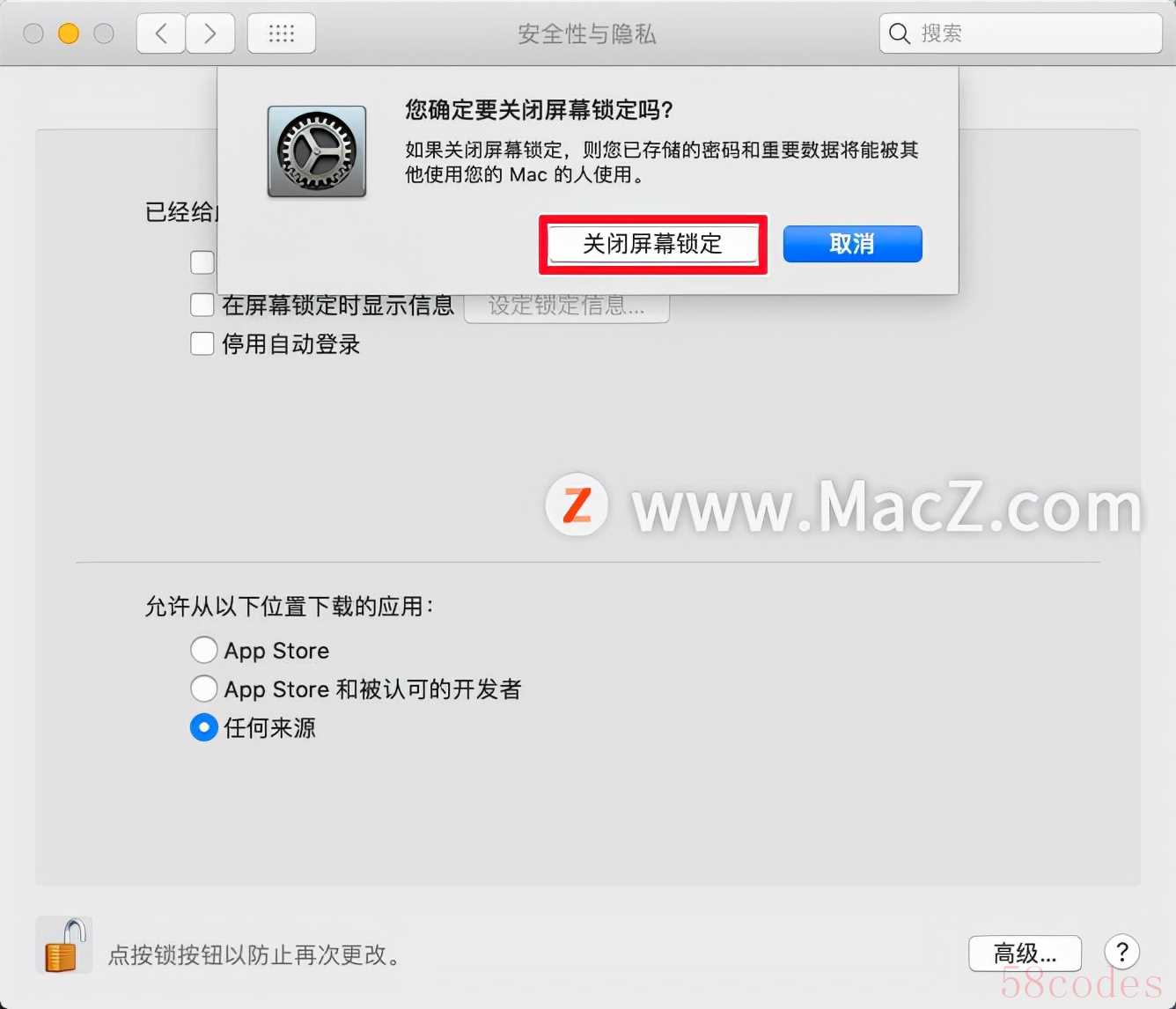 5.点选「关闭锁定屏幕」来确定关闭Mac唤醒时需要输入密码这功能。
