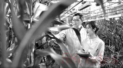 中国农业大学师生在作物功能基因组与分子育种研究中心查看玉米表型。资料图片